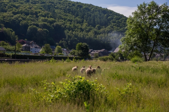 Six moutons roux ardennais - cinq brebis et un bélier - sont installés sur l’île du printemps à l’automne. « Le roux ardennais est un animal rustique qui convient bien à ce type de terrain austère et relativement accidenté », affirme Vincent Dehon, entrepreneur paysagiste en charge de l'entretien de l'île et l’un des deux propriétaires des moutons. « C'est un animal qui ne nécessite pas un apport d'eau quotidien: la rosée du matin lui suffit amplement. Il est également capable de mettre bas tout seul. Et puis, autre élément, le roux ardennais est un animal qui représente bien nos Ardennes.»