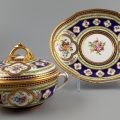 L’exposition met également en vue une écuelle couverte et son présentoir, eux aussi réalisés par la Manufacture royale de porcelaine de Sèvres. Ces pièces sont décorées de fleurs, d’oiseaux et d’amours peints en camaïeux, rehaussés d’or.