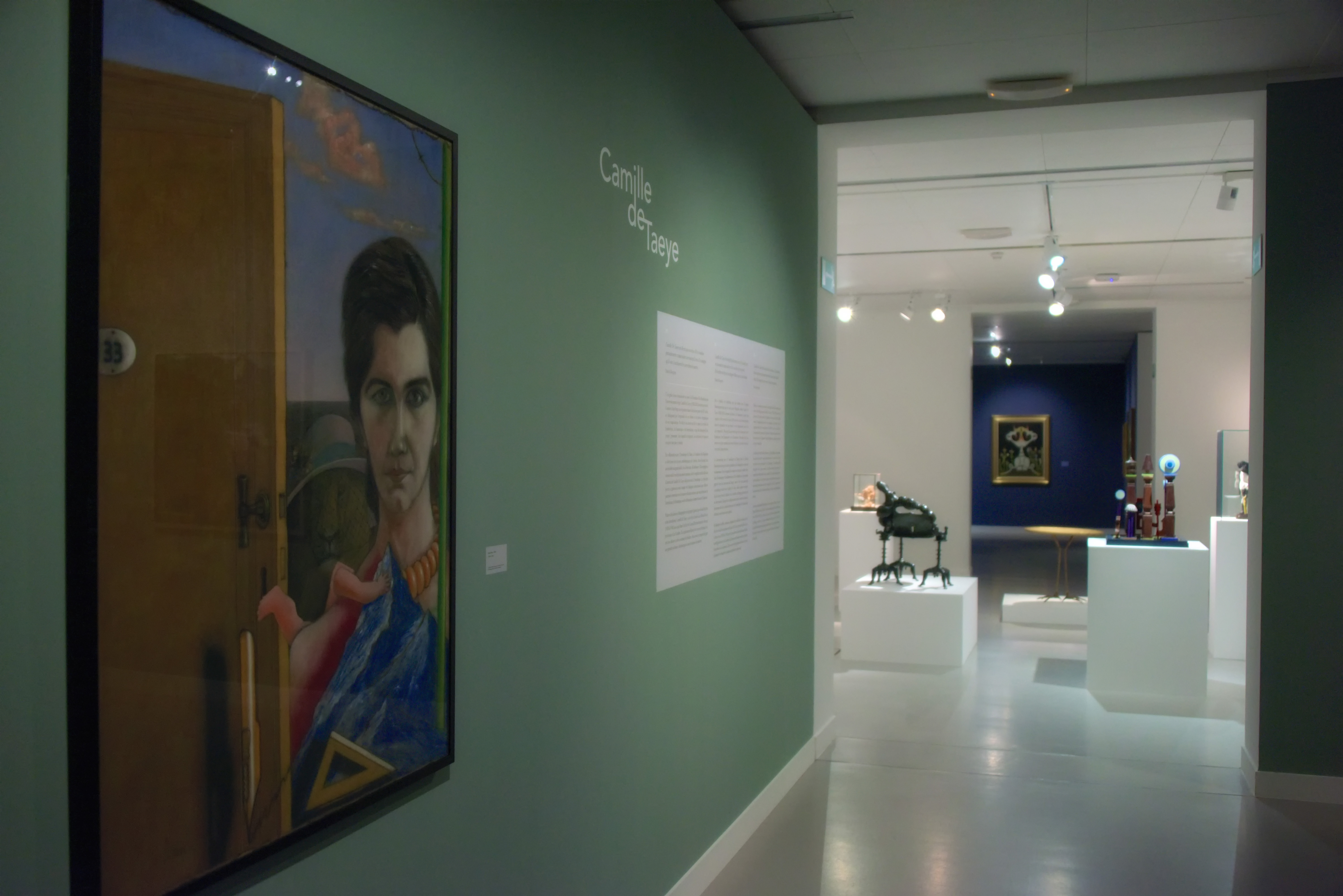 Camille De Taeye n’est pas considéré comme un peintre surréaliste en tant que tel. Ces œuvres se situent au croisement du symbolisme, du fantastique et du surréalisme. C’est la raison pour laquelle une section de l’exposition lui est consacrée. Les œuvres présentées témoignent d’une « grammaire » propre qu’il compose à partir de ses idées Dans ses tableaux, il rassemble divers objets dont certains très durs tels la scie ou des clous qui interagissent les uns avec les autres et créent ainsi une histoire particulière.