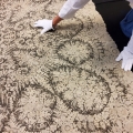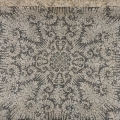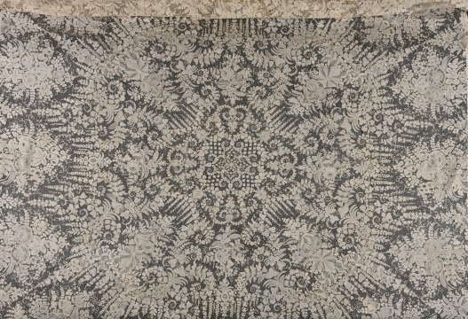 Le décor de cette pièce est particulièrement bien équilibré. Au centre, une somptueuse ornementation mêle branchages, feuilles et fleurs : feuilles de marronniers nervurées, dahlias, guirlandes de vignes et grappes de raisins, pivoines épanouies, roses, digitales, campanules, hortensias… Chaque angle reprend ces motifs dans de grands médaillons en goutte, et chaque bordure est décorée par trois médaillons reprenant toujours les mêmes motifs. Toute la pièce est encadrée d’une large bordure dense avec les mêmes éléments floraux. À ce jour, l’usage initial de la pièce demeure incertain : châle, cape, voile ou nappe ? Des recherches documentaires devraient permettre d’affiner nos connaissances. Ce que l’on sait, en revanche, est que le point de gaze, technique dentellière parmi les plus précieuses, était réservée aux pièces de prestige. Compte tenu de ses dimensions imposantes (200 x 195 cm), cette pièce est soit une commande, soit une œuvre de démonstration destinée à mettre en valeur le savoir-faire de la manufacture lors de grandes expositions de l’époque.