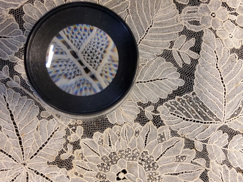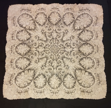 De forme carrée aux angles légèrement arrondis, l’œuvre textile est entièrement réalisée au point de gaze, une technique de dentelle à l’aiguille réputée pour sa finesse et sa complexité. Développée par des manufactures bruxelloises au 19e siècle qui produisaient ces pièces dans des ateliers locaux avant de les commercialiser à Bruxelles et à Paris, cette dentelle en coton se distingue par ses mailles aériennes qui relient des motifs floraux d’un réalisme saisissant. Mentionné pour la première fois lors de l’Exposition universelle de Londres en 1851, le point de gaze permet une grande variété de points et de nuances, traduisant avec virtuosité les contrastes et les détails des fleurs ornementales alors en vogue. Le fond léger, réalisé rangée par rangée avec un seul fil, confère à l’ensemble une légèreté remarquable. Le point de gaze est parfois appelé point de rose, en référence aux pétales superposés des roses souvent représentées.